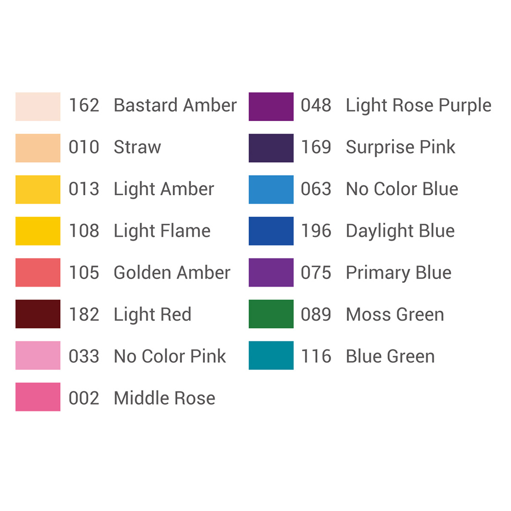 15 different colors include bastard amber, light rose purple, straw, surprise pink, light amber, no color blue, light flame, daylight blue, golden amber, primary blue, light red, moss green, no color pink, bule green and mibble rose.