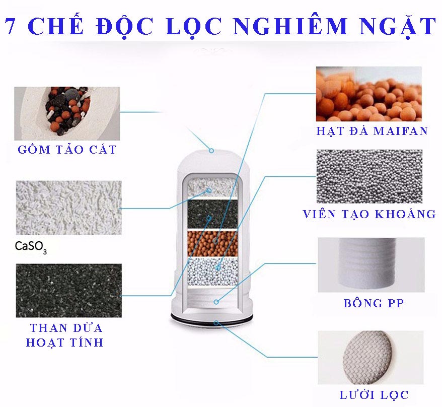 Với Bảy chế độ lọc: Hạt Alkaline, Than hoạt tính, đá Maifan, Tourmaline, CaSo3, Vải cotton không dệt, Lưới lọc loại bỏ vi khuẩn, vi sinh, các chất độc hại, clo, kim loại nặng, thuốc trừ sâu, rong rêu trong nước, đồng thời khử mùi, giúp nguồn nước trong lành, tươi mát và mềm mại hơn bao giờ hết. An toàn cho việc ăn uống và nấu nướng.