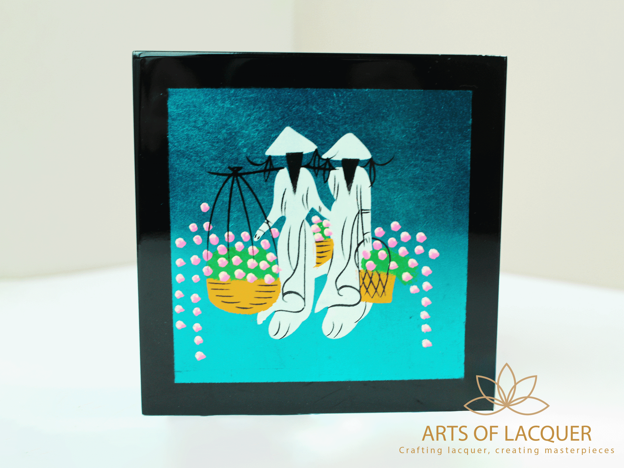 Đế lót ly được trang trí bằng những chấm bi màu hồng và trắng nhỏ xinh xắn xung quanh, giống như những bông hoa nhỏ đang rải rác xung quanh nhân vật, tạo thêm điểm nhấn và sự sống động cho sản phẩm. Logo của "Arts of Lacquer", sự kết hợp giữa hình ảnh truyền thống và phong cách hiện đại trong thiết kế mang lại vẻ đẹp rất riêng, phản ánh sự tinh tế trong việc bảo tồn và phát huy nghệ thuật sơn mài Việt Nam.