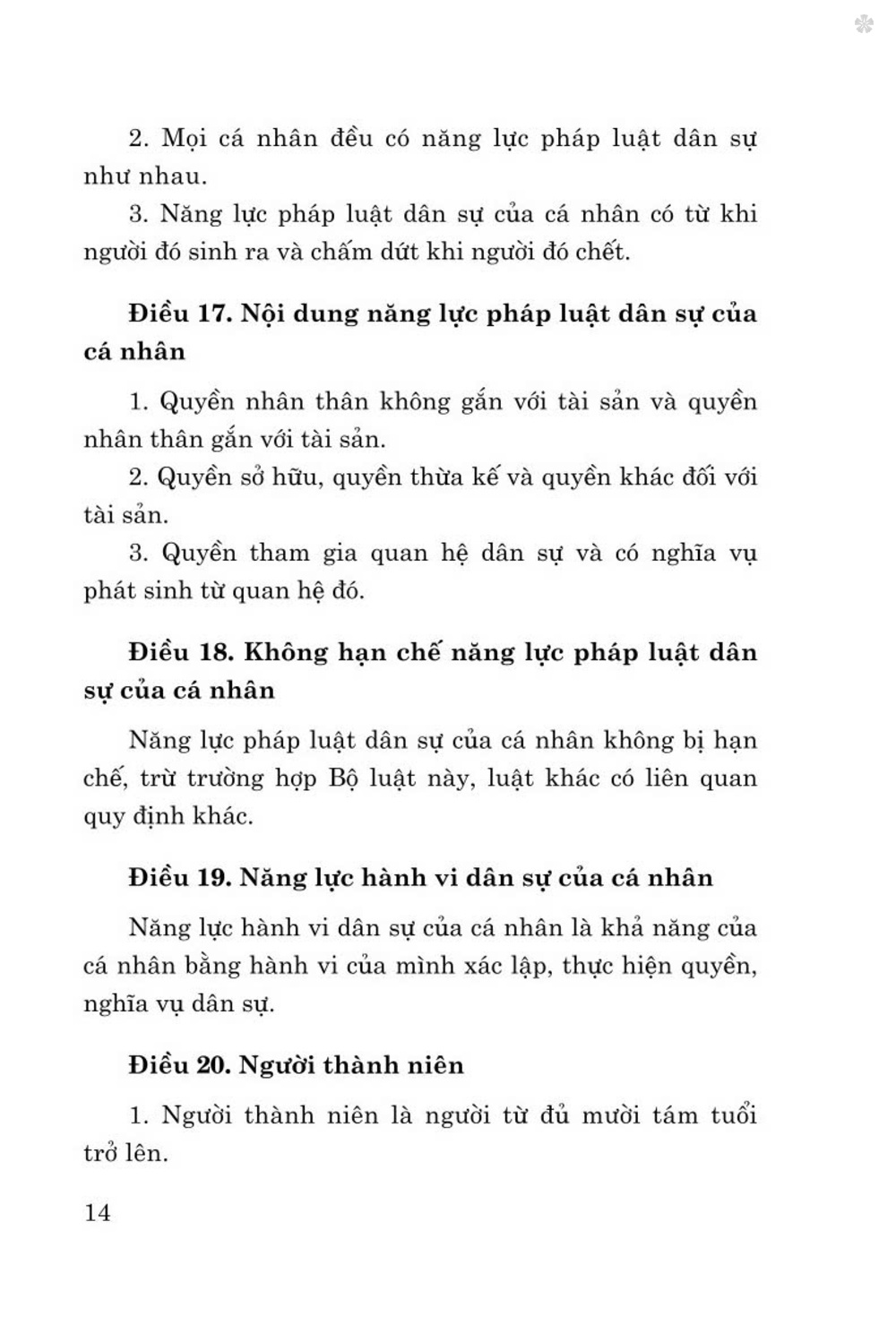 Mua tại TiktokBộ luật Dân sự năm 2015 quy định địa vị pháp lý, chuẩn mực pháp lý về cách ứng xử của cá nhân, pháp nhân; quyền, nghĩa vụ về nhân thân và tài sản của cá nhân, pháp nhân trong các quan hệ được hình thành trên cơ sở bình đẳng, tự do ý chí, độc lập về tài sản và tự chịu trách nhiệm. Bộ luật thể hiện sự thay đổi mạnh mẽ trong tư duy của các nhà làm luật với nhiều quy định mới mang tính đột phá từ kết cấu, kỹ thuật lập pháp với nhiều nội dung mới so với Bộ luật Dân sự năm 2005 theo từng chế định như: tài sản, thừa kế, bồi thường thiệt hại...