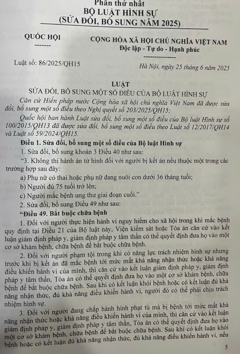 Ghi chú: Bộ luật Hình sự, Bộ luật Tố tụng Hình sự sửa đổi, bổ sung năm 2025, chưa phải là bản hợp nhất.
