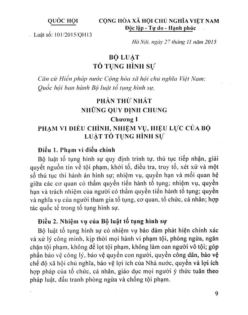 Bình Luận Khoa Học Bộ Luật Tố Tụng Hình Sự Năm 2015 (Tái Bản) Bộ luật tố tụng hình sự 2015 được Quốc hội thông qua ngày 27-11-2015, có hiệu lực từ ngày 1-1-2018. Việc