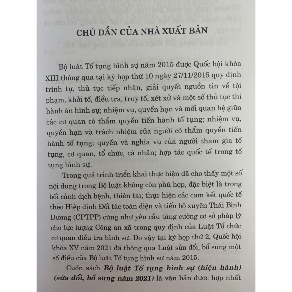 Phiên bản Bộ luật tố tụng hình sự năm 2015 (đính kèm 4 trang nội dung chỉnh sửa năm 2021), nên bạn đọc cân nhắc khi mua tham khảo Bộ luật tố tụng