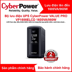✨Bộ lưu điện UPS CyberPower VALUE Pro VP1600ELCD - 1600VA/960W - Tích hợp điều khiển Nas, pc, Màn hình hiển thị LCD, dòng sản phẩm cao cấp - Hàng Chính Hãng