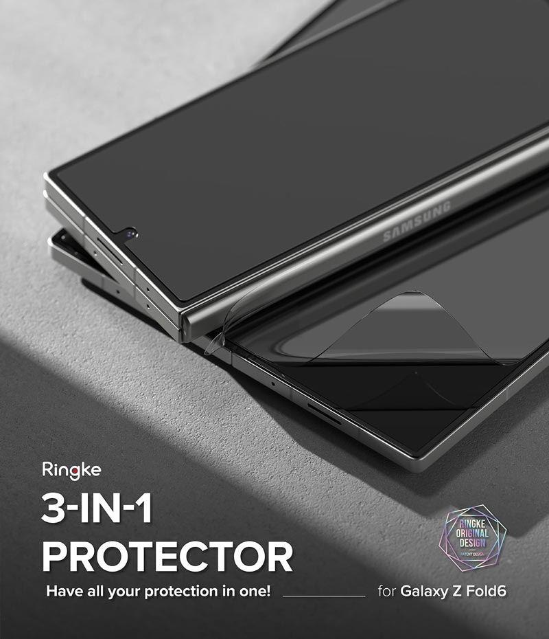Bộ dán màn hình Samsung Galaxy Z Fold 6 RINGKE 3-in-1 Protector giúp bảo vệ toàn diện màn hình và bản lề cho điện thoại Samsung Galaxy Z Fold 6 gồm: dán cường lực màn hình ngoài, dán mềm màn hình bên trong và dán mềm cho phần bản lề giúp chống trầy.