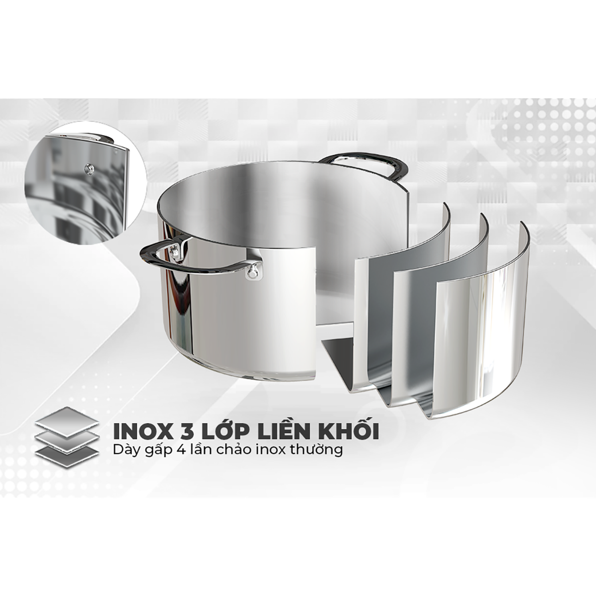 Bộ nồi inox đa lớp Sunhouse Mama SHG701 có thân nồi được thiết kế 3 lớp nguyên khối: lớp ngoài cùng Inox 430 có hiệu suất bắt từ cao nhất trong các loại inox hiện nay, lớp nhôm ở giữa tăng hiệu quả truyền nhiệt, lớp trong cùng Inox 304 an toàn tuyệt đối cho sức khỏe và có khả năng kháng ăn mòn cực tốt.