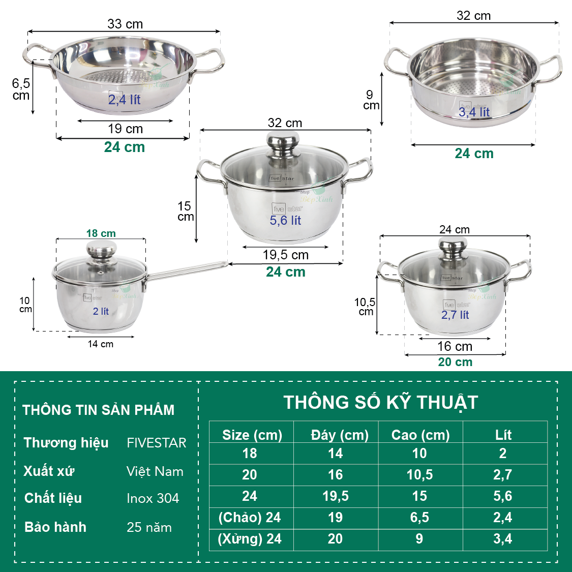 Xoong Nhỏ: 20 x 10 cm 2.5L Nồi Hầm: 24 x 12 cm 4.1L Chảo Chiên Nhỏ 20 x 4.5 cm 1.0L Chảo Rán Vừa 24 x 4.5 cm 1.7L Đánh bột x 1 Muôi