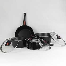 Set gồm 6 món tiện dụng: • Chảo nhỏ 20cm & chảo lớn 24cm • Quánh nhỏ 16cm & quánh lớn 18cm (đều kèm nắp) • Nồi nhỏ 24cm & nồi lớn 24cm (đều kèm