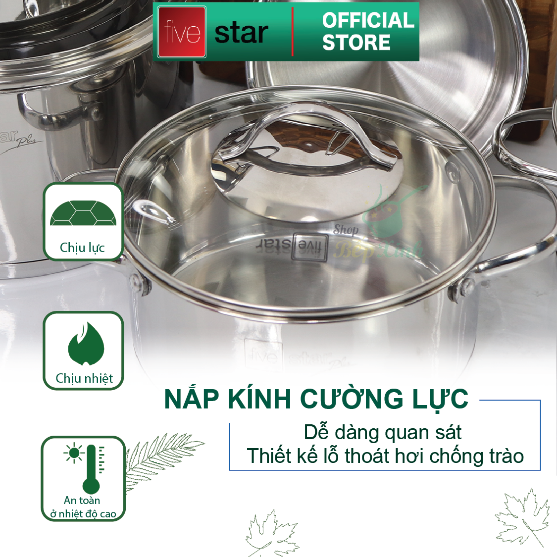 Bộ nồi chảo xửng hấp 3 Đáy Inox 430 cao cấp Fivestar Standard bếp từ nắp kính , tặng 1 vá canh Bộ nồi inox có 9 món gồm : +Quánh có đường kính