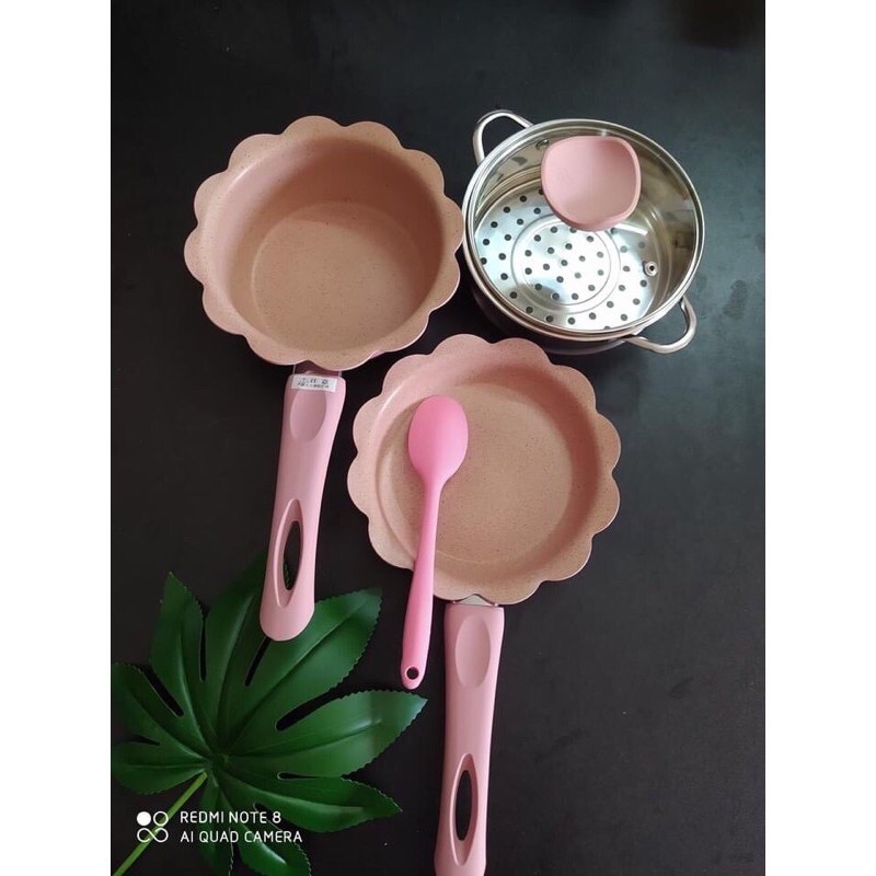 Bộ nồi chảo đá nấu ăn dặm cho bé -men đá chống dính kèm xửng hấp inox hình hoa tráng men đá cao cấp