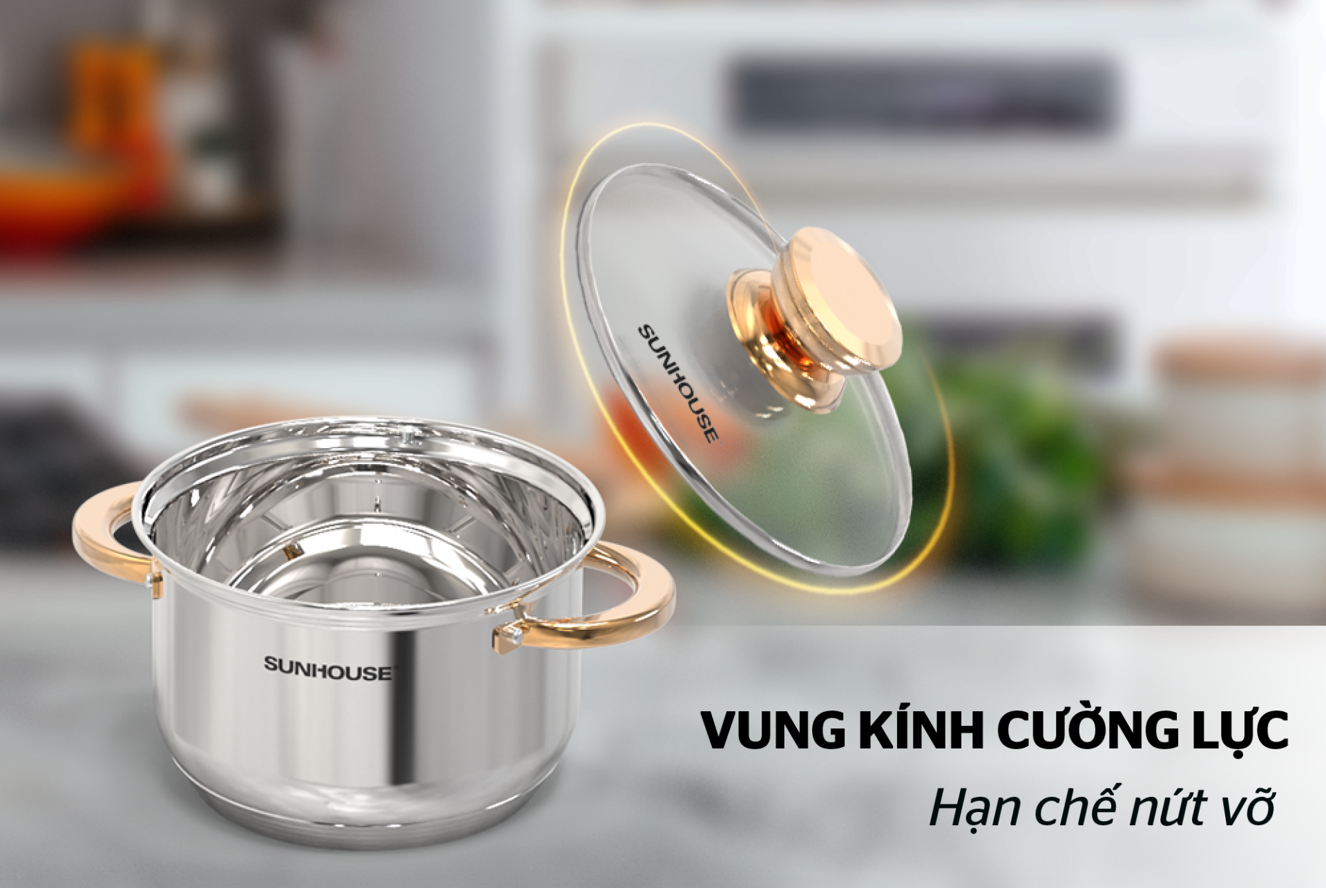 Vung kính cường lực hạn chế nứt vỡ khi va đập Bộ nồi được trang bị vung kính cường lực viên Inox chắc chắn, hạn chế nứt vỡ, trầy xước khi va đập. Vung kính trong suốt, sáng bóng giúp bạn dễ dàng quan sát thực phẩm trong quá trình nấu nướng.