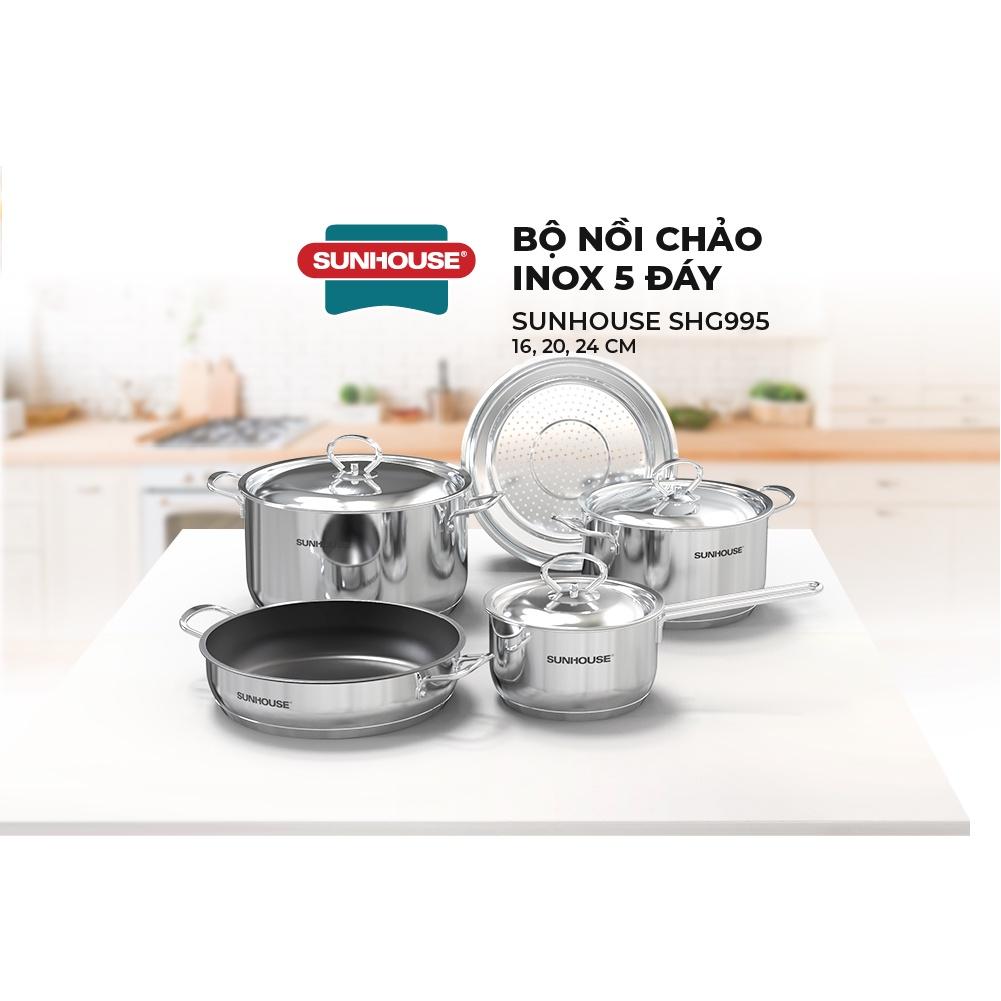Bộ nồi chảo inox 5 đáy SUNHOUSE SHG995 sử dụng được với mọi loại bếp, kể cả bếp từ. Bộ sản phẩm gồm 01 quánh 16 cm, 02 nồi với đường kính 20 – 24 cm, 01 chảo 24 cm và 01 xửng hấp 24 cm phù hợp với nhu cầu nấu nướng của mọi gia đình. Quánh nhỏ 16cm thích hợp để luộc trứng, nấu mì, nấu cháo, nồi cỡ trung 20 – 24 cm để nấu canh, nấu lẩu cho 2 – 4 người và chảo 24 cm có chiên xào lượng thực phẩm lớn cho 3 – 5 người ăn. Ngoài ra, với xửng hấp 24 cm đi kèm, bạn sẽ dễ dàng hấp xôi, bánh bao, hâm nóng thức ăn và chế biến nhiều món ăn khác cho gia đình.