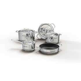 • Bộ nồi chảo gồm 5 món tiện dụng: 2 nồi, 1 chảo, 1 quánh, 1 xửng hấp