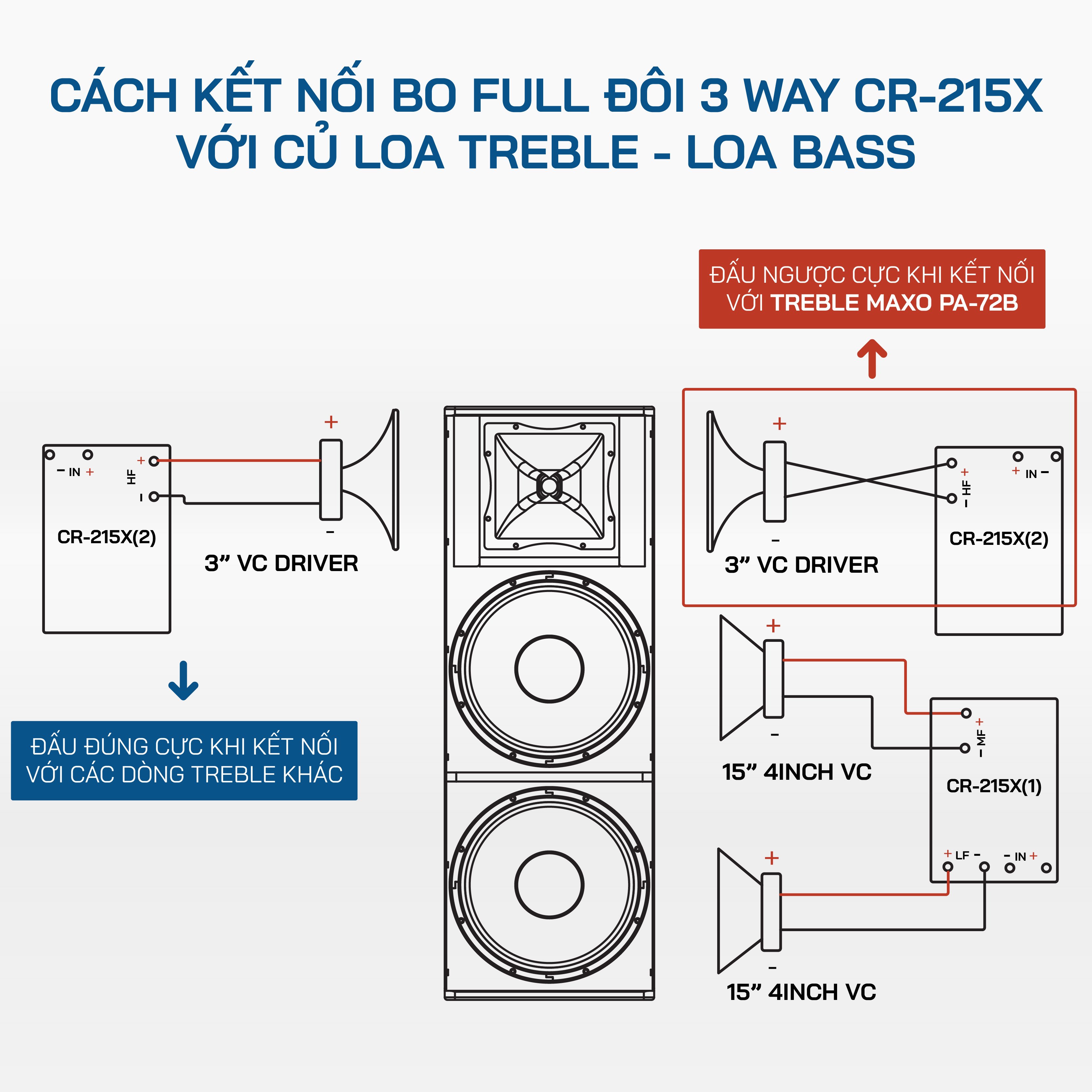 Đối với Bo CR215X (2) đấu NGƯỢC CỰC ( + – ) (- +) với củ loa treble của MAXO PA72B (chỉ duy nhất củ treble MAXO mới đấu ngược cực).