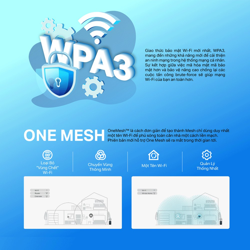 Router 3200Mbps Wi-Fi 6 Dual-band Gigabit Mesh: - Băng thông lớn; CPU lõi kép 4 luồng, hỗ trợ NAT - Truy cập đồng thời 48 người dùng (đề xuất) truy cập Wifi hai dải băng