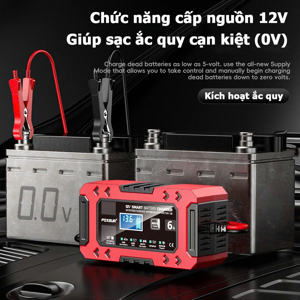 Bộ Sạc Ắc Quy FOXSUR 12V 6A Hàng Nhật – Sạc Thông Minh 10 Giai Đoạn, Khử Sunfat, Tự Động Ngắt Cho Ắc Quy 4AH - 120AH