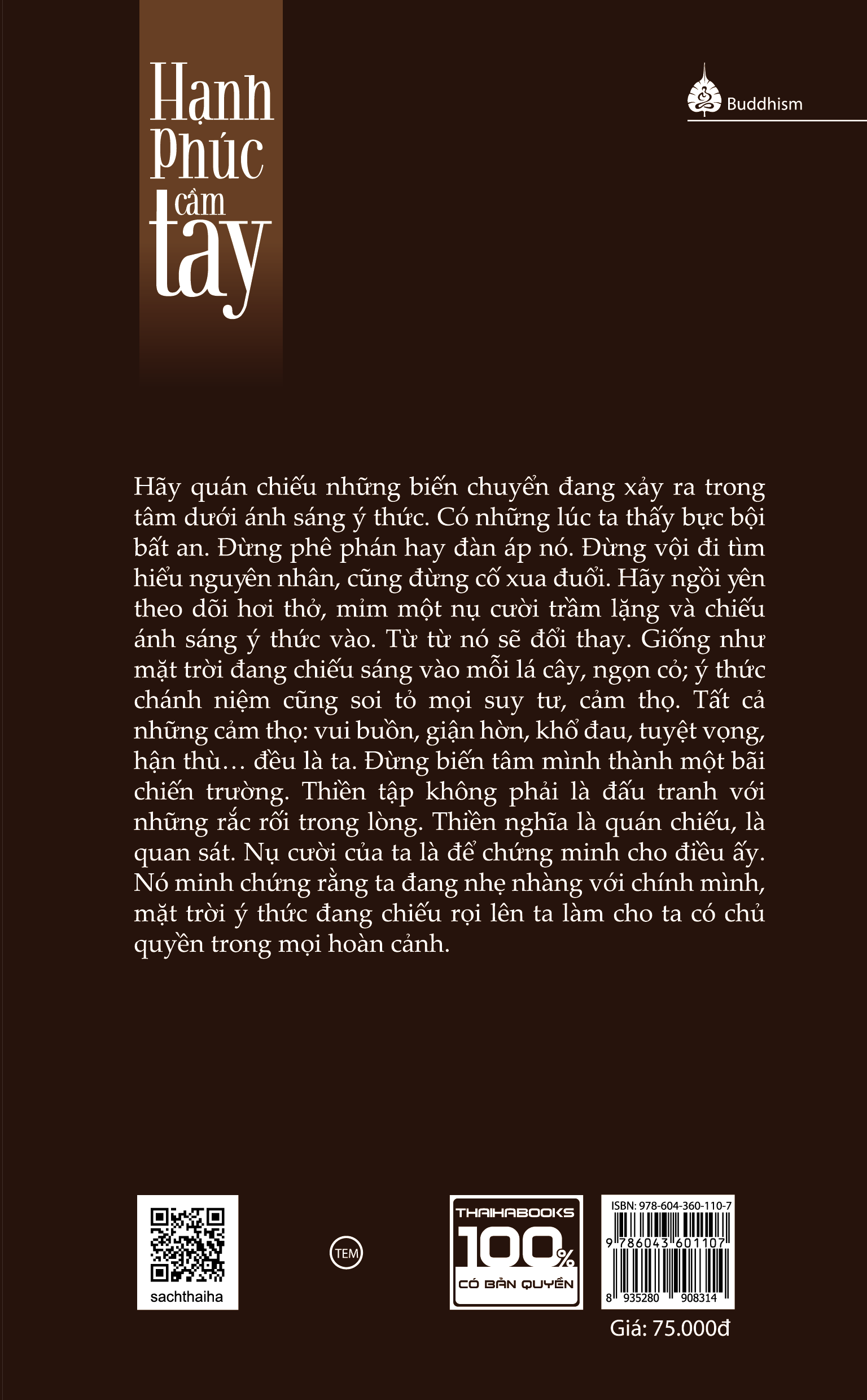 Trong đó “Hạnh phúc cầm tay”, “Gieo trồng hạnh phúc”, “Tĩnh lặng”, “Muốn an được an” là những tác phẩm giúp ta thực tập chánh niệm để tìm thấy nguồn năng lượng tỉnh thức, đưa bản thân về với phút giây hiện tại và tiếp xúc sâu sắc nhất sự sống hằng ngày. Hãy luôn luôn an trú trong giây phút hiện tại, bây giờ và ở đây.