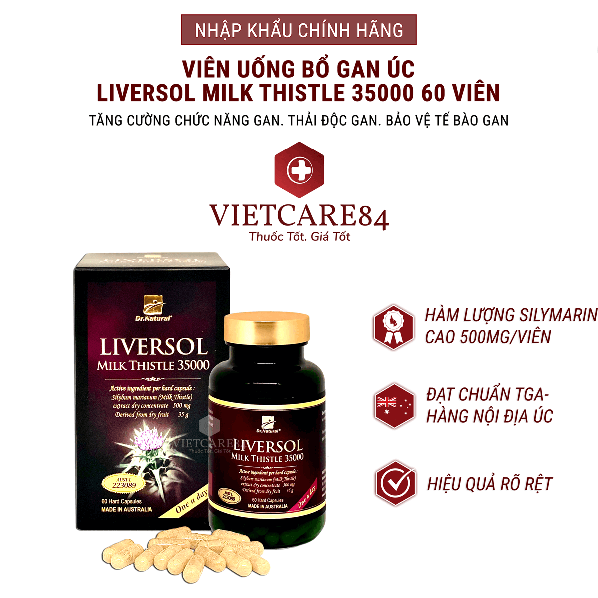 Viên uống thải độc gan Dr Natural LiverSol Milk Thistle 35000 là sản phẩm bổ gan cao cấp nhập khẩu chính hãng nguyên hộp từ Úc. Nếu bạn đang tìm kiếm một sản phẩm bổ gan nhập khẩu chính hãng thực sự tốt, Liversol là một lựa chọn phù hợp.