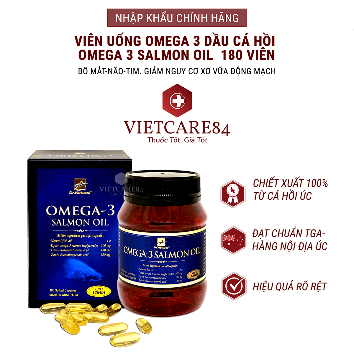 DR NATURAL OMEGA 3 SALMON OIL 180 VIÊN Viên dầu cá hồi DR NATURAL OMEGA 3 SALMON OIL là một sản phẩm chất lượng của tập đoàn dược phẩm Astragrace (Úc). Astragrace nổi tiếng