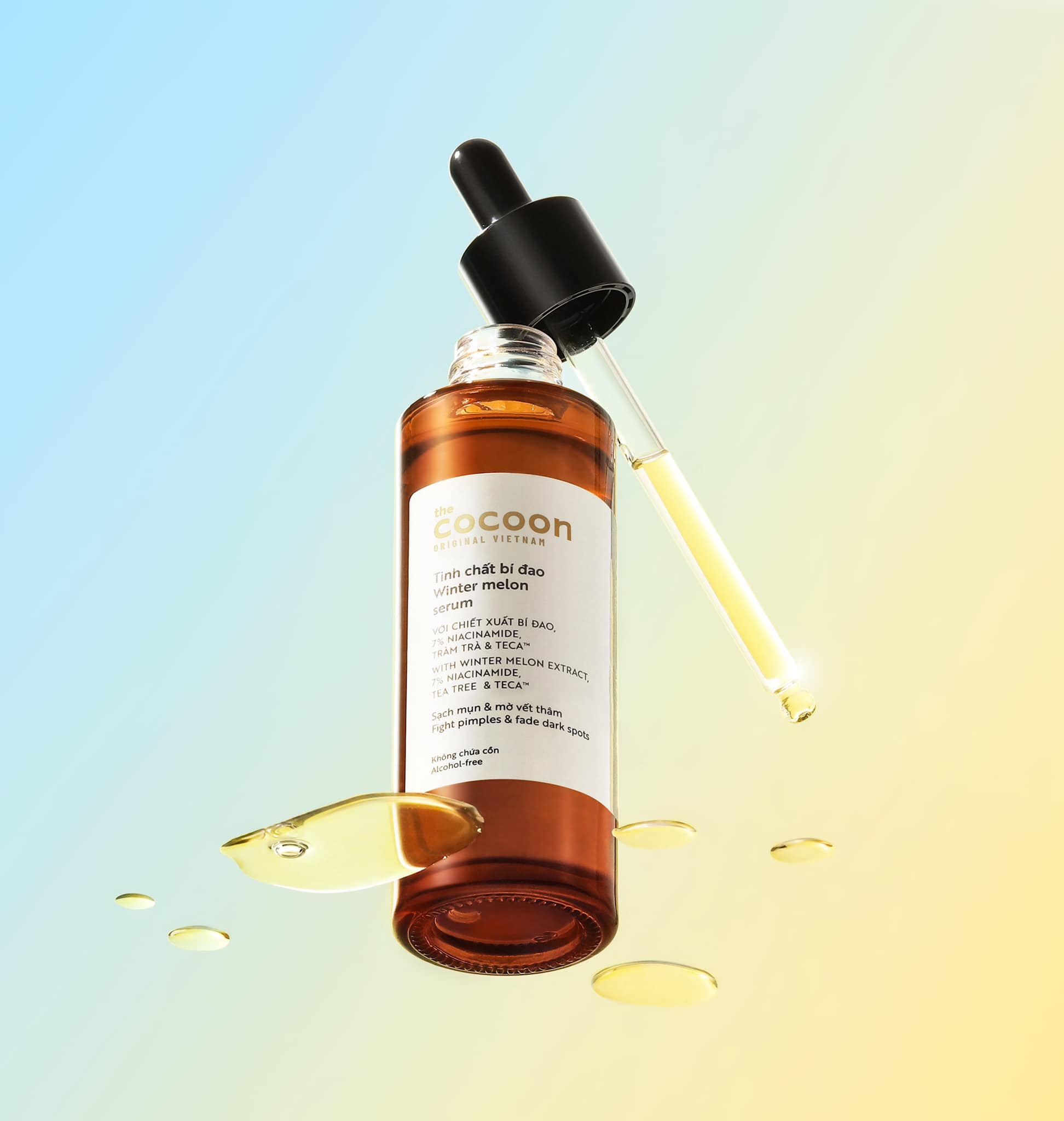 - Vitamin B3 (Niacinamide): Giúp hỗ trợ hết mụn hiệu quả, kiểm soát lượng dầu thừa và làm giảm sự xuất hiện của lỗ chân lông to. Thành phần đầy đủ tinh chất bi đao cocoon Aqua/Water, Niacinamide, Salicylic Acid, Cocamidopropyl Dimethylamine, Benincasa Cerifera Fruit Extract, Centella Asiatica Extract, Butylene Glycol, Pentylene Glycol, Bisabolol, Zinc PCA, Phellodendron Amurense Bark Extract, Glycereth-26, Bis-PEG-18 Methyl Ether Dimethyl Silane, Melaleuca Alternifolia Leaf Oil, Lavandula Angustifolia Flower Oil, Rosmarinus Officinalis Leaf Oil, Phenoxyethanol, Trisodium Ethylenediamine Disuccinate, Ethylhexylglycerin, Farnesol. Hướng dẫn sử dụng tinh chất bi đao cocoon Lấy vài giọt tinh chất vào lòng bàn tay, xoa đều và mát-xa lên da mặt sạch, tránh vùng mắt. Sử dụng sáng và tối. Cam kết tinh chất bi đao cocoon