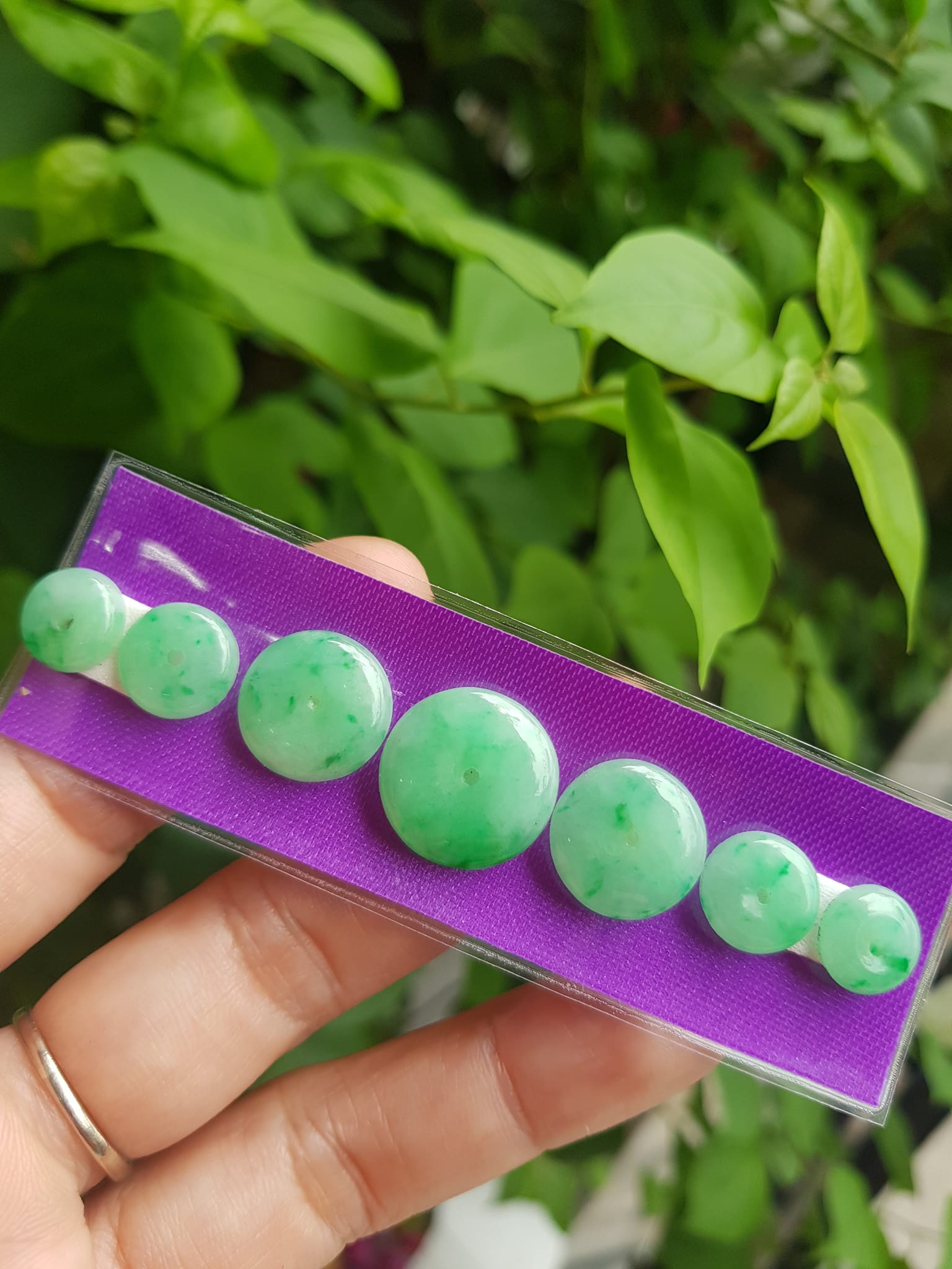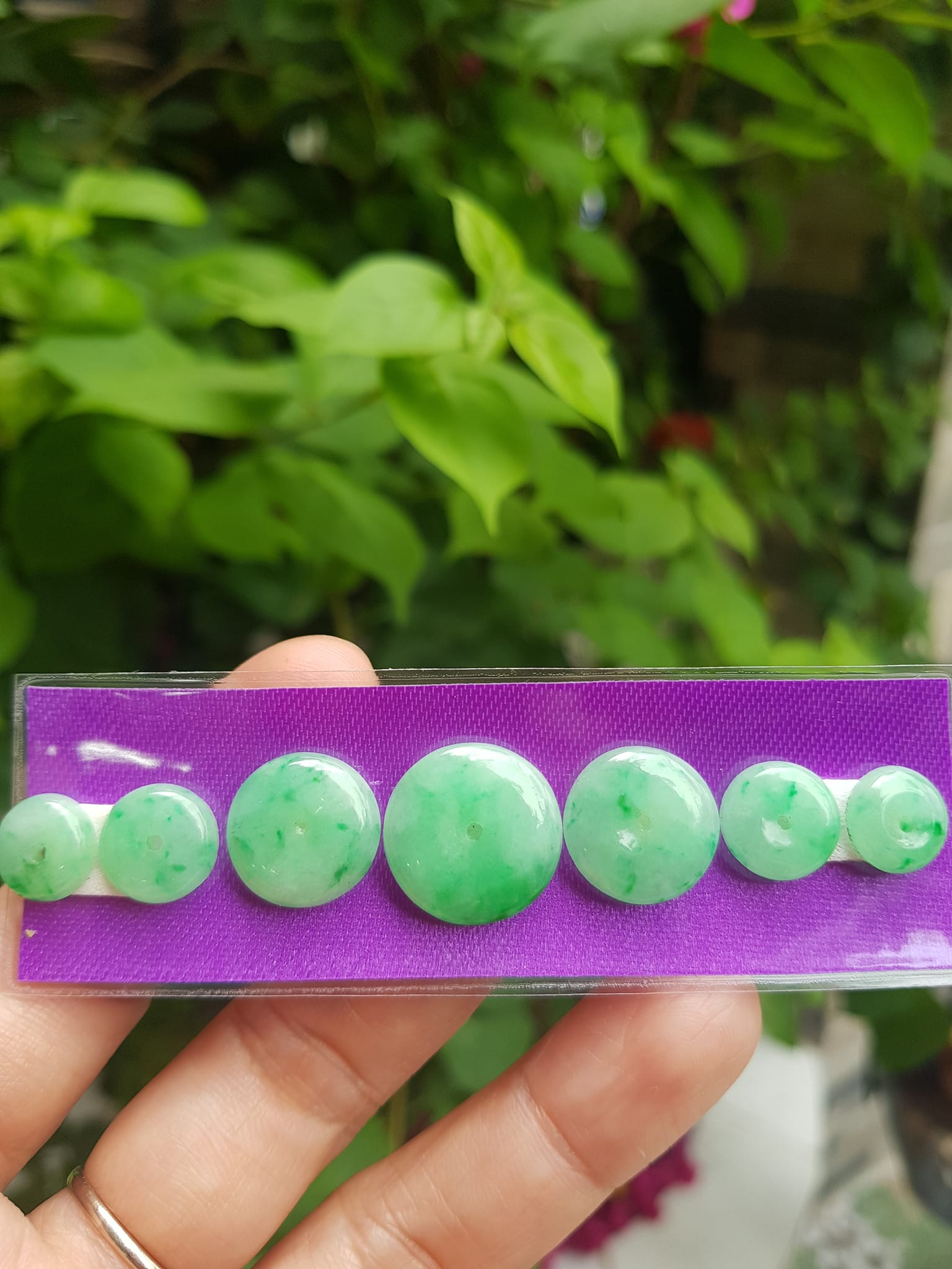 Bộ 5 đồng tiền đá cẩm thạch tự nhiên xanh ngọc đậm đều đẹp Nữ Phối vòng tay,mặt dây chuyền vàng đeo cực kỳ xinh xắn ạ Size hạt 9mm x dầy 3,8mm x lỗ