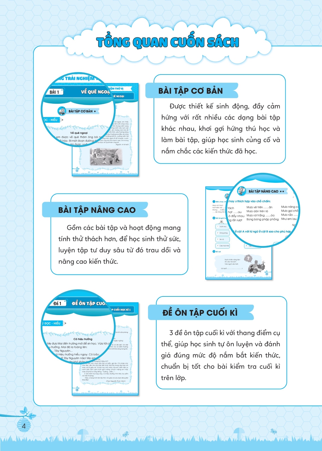 - Bài tập nâng cao: Phần này sẽ cung cấp 1 số các bài tập và hoạt động mang tính thử thách hơn, để các em thử sức, luyện tập tư duy sâu từ đó trau dồi và nâng cao kiến thức. Cuốn sách cũng cung cấp 3 đề ôn tập cuối kì với thang điểm cụ thể, để các em tự ôn luyện và đánh giá đúng mức độ nắm kiến thức, chuẩn bị tốt kiến thức và tâm lý cho bài kiểm tra cuối kì.