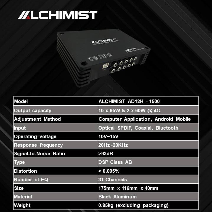 Bộ xử lý tín hiệu số Alchimist AD12H-1500 là thiết bị DSP 12 kênh cao cấp dành cho những người đam mê âm thanh xe hơi. Sản phẩm được trang bị 6 cổng đầu ra High Level hỗ trợ loa công suất lớn và 6 cổng Line Level dành cho amply ngoài, mang đến trải nghiệm âm thanh đầy đủ và linh hoạt. Sử dụng chip DSP thế hệ mới AD12Pro, AD12H-1500 cho khả năng tinh chỉnh nhanh chóng, chính xác với giao diện phần mềm thân thiện, hỗ trợ điều chỉnh real-time.