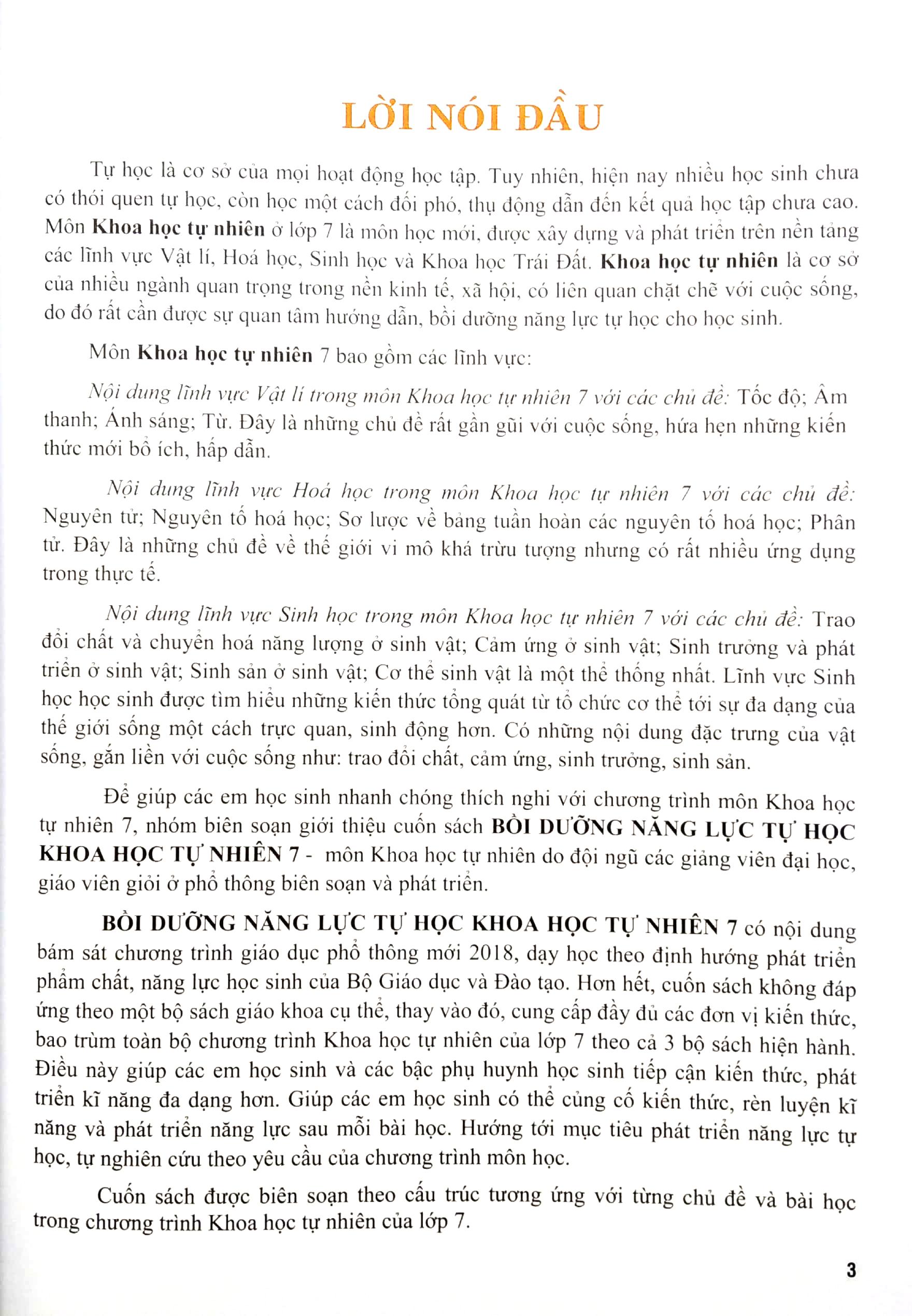 Nhóm biên soạn hi vọng cuốn sách BỒI DƯỠNG NĂNG LỰC TỰ HỌC KHOA HỌC TỰ NHIÊN 7 sẽ là người bạn đồng hành hữu ích cùng các em học sinh cùng khám phá thế giới tự nhiên, phát triển nhận thức, tư duy logic và khả năng vận dụng kiến thức vào thực tiễn. Nhóm tác giả chân thành cảm ơn và hi vọng sẽ nhận được các ý kiến đóng góp quý báu của bạn đọc để lần tái bản sau được hoàn thiện hơn.