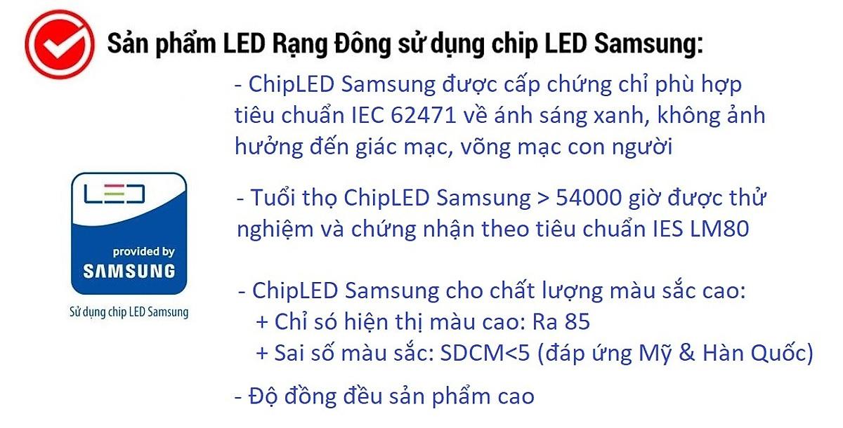 Sử dụng chip LED Samsung cho tuổi thọ cao trên 25.000 giờ sử dụng Vỏ chất liệu nhôm thuần được phủ lớp sơn nano cho màu sắc tương đồng với màu sắc hệ trần thạch
