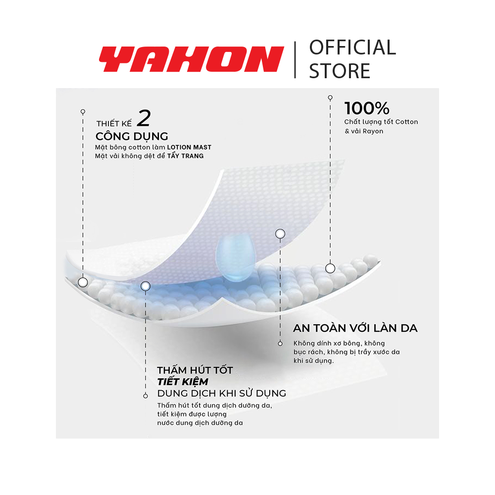 Đặc Điểm Nổi Bật: Sản phẩm có thiết kế 2 mặt, với công dụng :Một mặt bằng vải không dệt Rayon phẳng trơn mịn dùng để các sản phẩm dưỡng da, trang điểm.Một mặt bằng