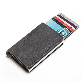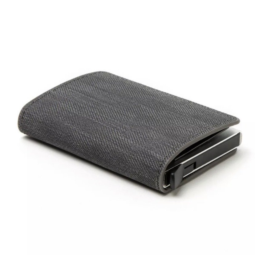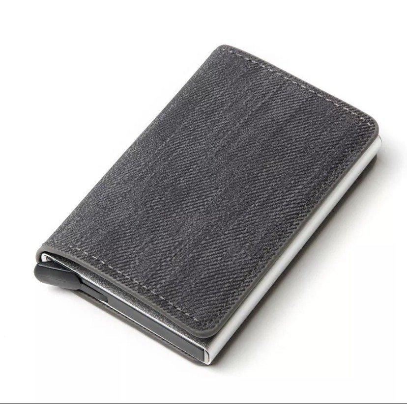 - Chất liệu của bóp ví: làm từ chất liệu da phủ vải denim, hộp đựng thẻ bằng hợp kim nhôm, bóp vô cùng chắc chắn, gọn nhẹ khi cầm trên tay
