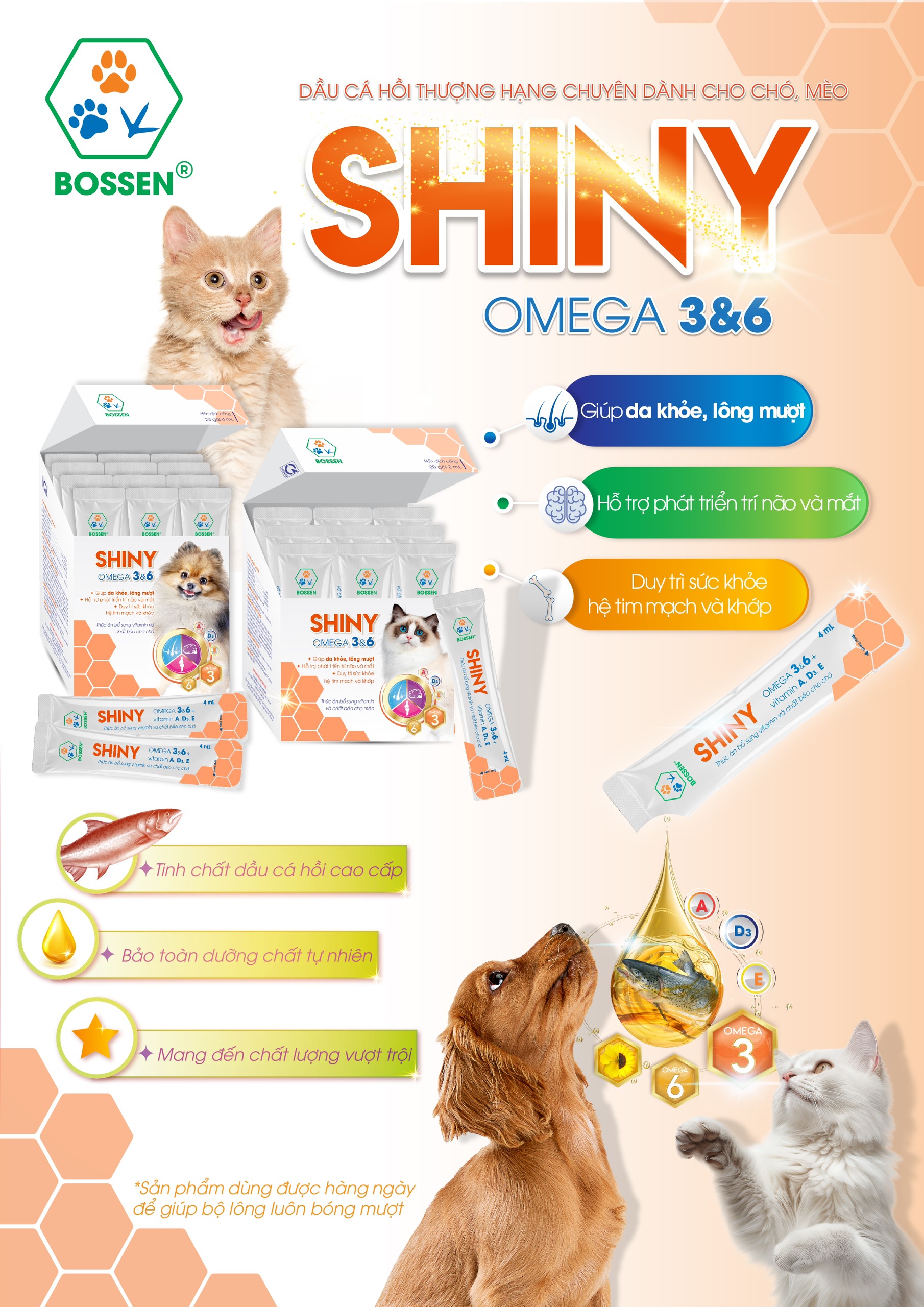 ✨BOSSEN - SHINY for Cat Bổ sung Vitamin và Acid béo Thiết Yếu cho Mèo - Hộp nguyên 20 gói 2ml