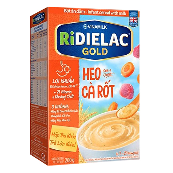 Mua tại Tiktok- Bột Ăn Dặm Vinamilk Ridielac Gold Heo Cà Rốt (200g / Hộp Giấy) là thức ăn bổ sung và được ăn thêm cùng với sữa mẹ dùng cho trẻ trên 06 tháng tuổi