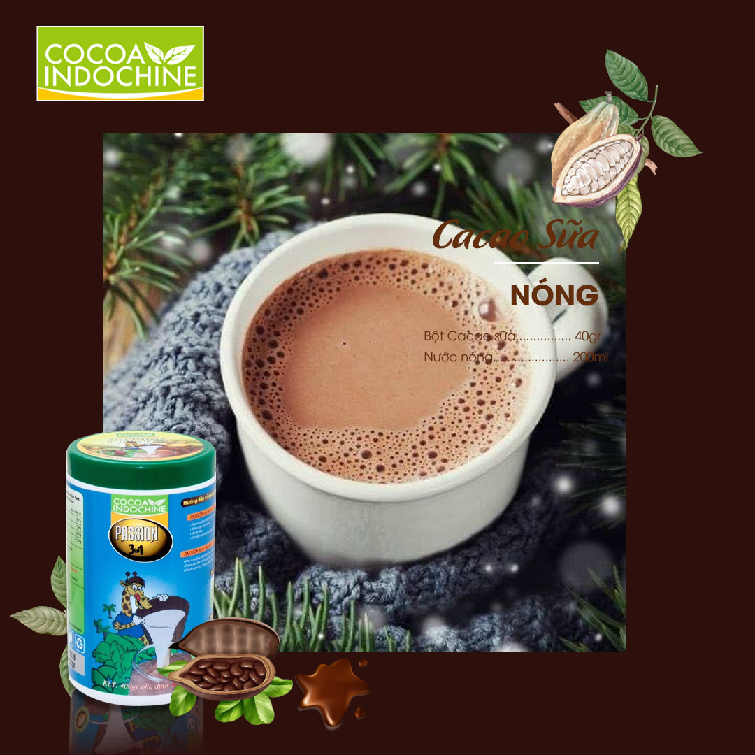 - Bột Cacao Hòa Tan Passion 3 In 1 Cocoa Indochine có mùi vị thơm ngon, giàu dinh dưỡng với sự kết hợp độc đáo giữa hương Sôcôla đen thơm nồng và hương vị Cappuccino đầy mê hoặc.