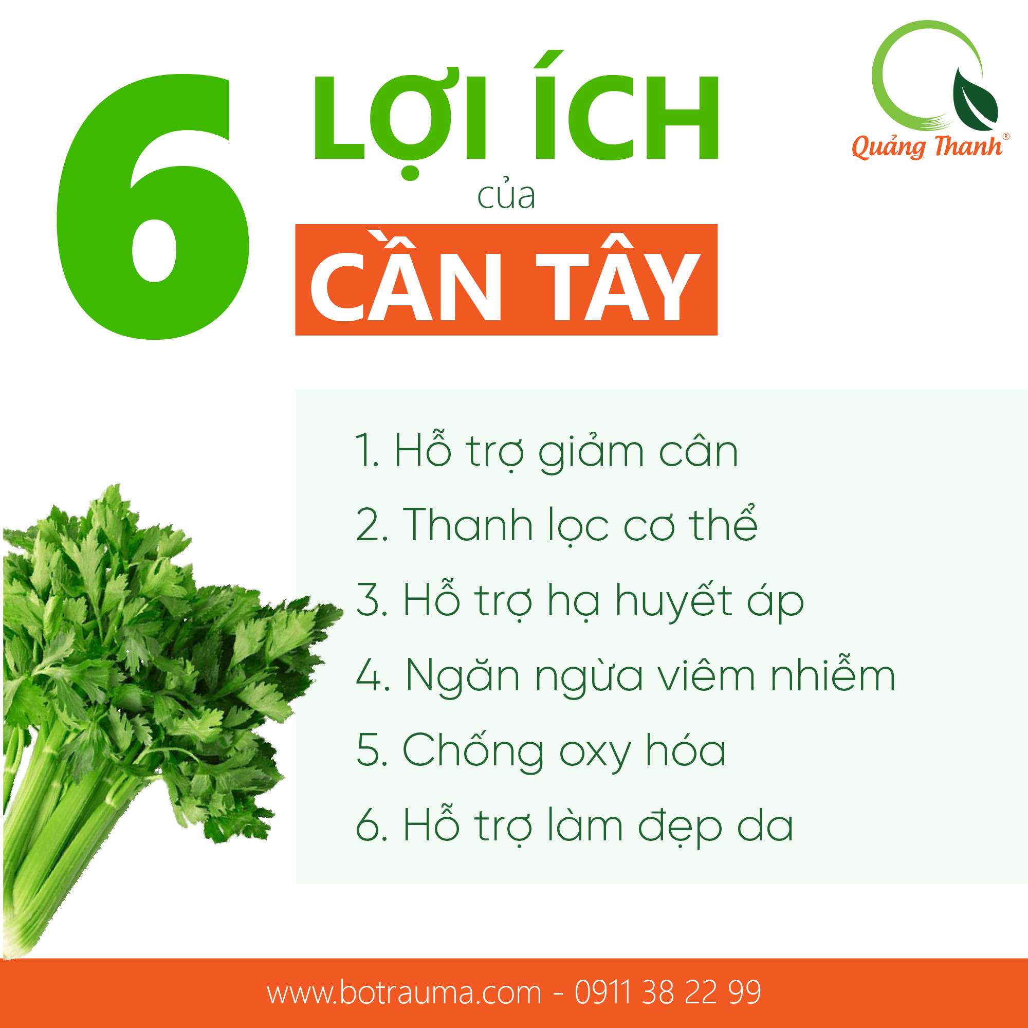 - Mua hàng 1 lần, chăm sóc khách hàng trọn đời. CÔNG DỤNG BỘT CẦN TÂY QUẢNG THANH Cần tây không chỉ là nước uống xu hướng tức thì mà đây là loại thức uống có giá trị dinh dưỡng bền vững, giải quyết các rắc rối thường gặp của cơ thể. Trong cần tây chứa rất nhiều chất dinh dưỡng nên ngoài cung cấp nước, chất xơ cho cơ thể, cần tây còn mang lại rất nhiều lợi ích khác như hỗ trợ ổn định huyết áp, hỗ trợ hệ tiêu hóa, hỗ trợ đẹp da. Còn chờ gì mà không nâng cấp bản thân "Da đẹp dáng xinh" cùng bột cần tây Quảng Thanh Cùng điểm qua 6 công dụng của cần tây: