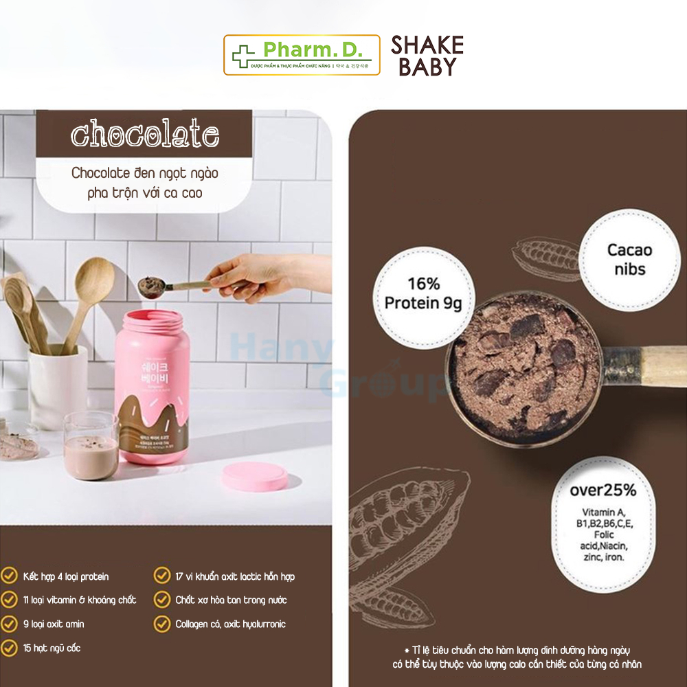 Bột Ngũ Cốc Ăn Kiêng Thay Thế Bữa Ăn Diet Formular Protein Shake Baby Vị Socola Kẹo Dẻo ( Marshmallow Chocolate Flavor) Dung tích: Dạng hộp 750g Thương hiệu: Shake Baby Xuất xứ: Hàn Quốc Bột ngũ cốc protein Shake Baby là sản phẩm mang tới công thức hiệu quả trong việc kiểm soát cân nặng, hay đặc biệt còn có thể cung cấp, bổ sung năng lượng như một bữa ăn mà vẫn giúp cơ thể có được lượng dinh dưỡng cần thiết. Bột ngũ cốc protein Shake Baby là dòng sản phẩm được yêu thích và tiêu thụ nhiều nhất Best & Steady tại "xứ sở Kim Chi". ️ ĐẶC ĐIỂM NỔI BẬT CỦA SHAKE BABY 750G - Đa dạng với 10 hương vị thơm ngon phù hợp với khẩu vị của từng khách hàng. - Dinh dưỡng cân bằng (9 loại axit amin, 11 loại vitamin & khoáng chất). - 25% vitamin & khoáng chất trở lên mỗi ngày.