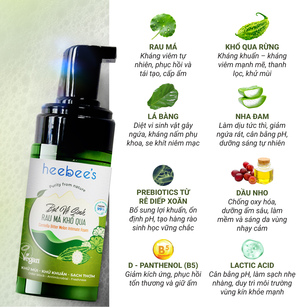 - Bọt Vệ Sinh Rau Má Khổ Qua Rừng Heebee’s là sự kết hợp giữa công nghệ tạo bọt thế hệ mới từ ngô và dầu dừa, cùng hệ chiết xuất xanh từ Rau Má, Khổ Qua Rừng, Lá Bàng và Nha Đam – tạo nên lớp bọt mịn mượt, nhẹ nhàng làm sạch sâu mà không gây khô rát.