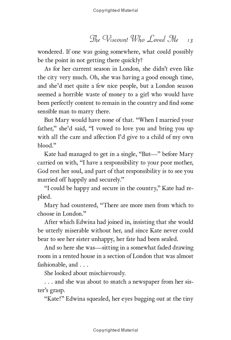 The only obstacle in his way is Edwina's older sister, Kate. Kate is determined to do all she can to allow her sister the chance to marry for love rather than convenience. And the roguish viscount is beginning to think he may have met his match in Kate's keen wit and sharp tongue. Until, that is, he makes the mistake of kissing
