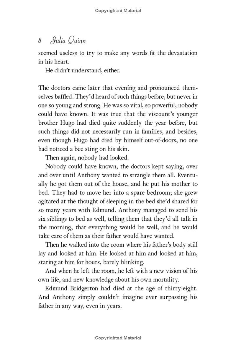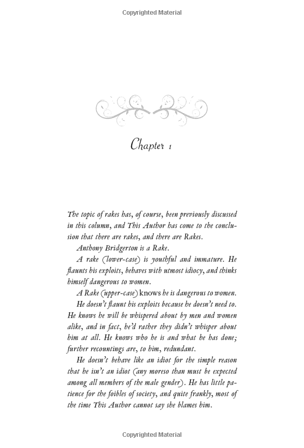 Contrary to popular belief, Kate is quite sure that reformed rakes do not make the best husbands—and Anthony Bridgerton is the most wicked rogue of them all. Kate’s determined to protect her sister—but she fears her own heart is vulnerable. And when Anthony’s lips touch hers, she’s suddenly afraid she might not be able to resist the reprehensible rake