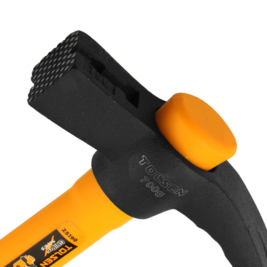 - X được thiBúa Sừng Dê Cán Nhựa Đầu Đen Tolsen 25190t kế 2 đầu: 1 đầu tròn để đóng đinh và một đầu sừng dê dùng để nhổ, tán đinh. Lưỡi búa được thiết