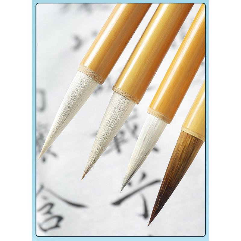 Combo bộ bút vẽ thuỷ mặc cơ bản gồm 4 cây. Cây to (kiêm hào lông hỗn hợp) vẽ lá sen, núi, thân gỗ gồ ghề. Cây lông nâu (lang hào) vẽ thân trúc, lá