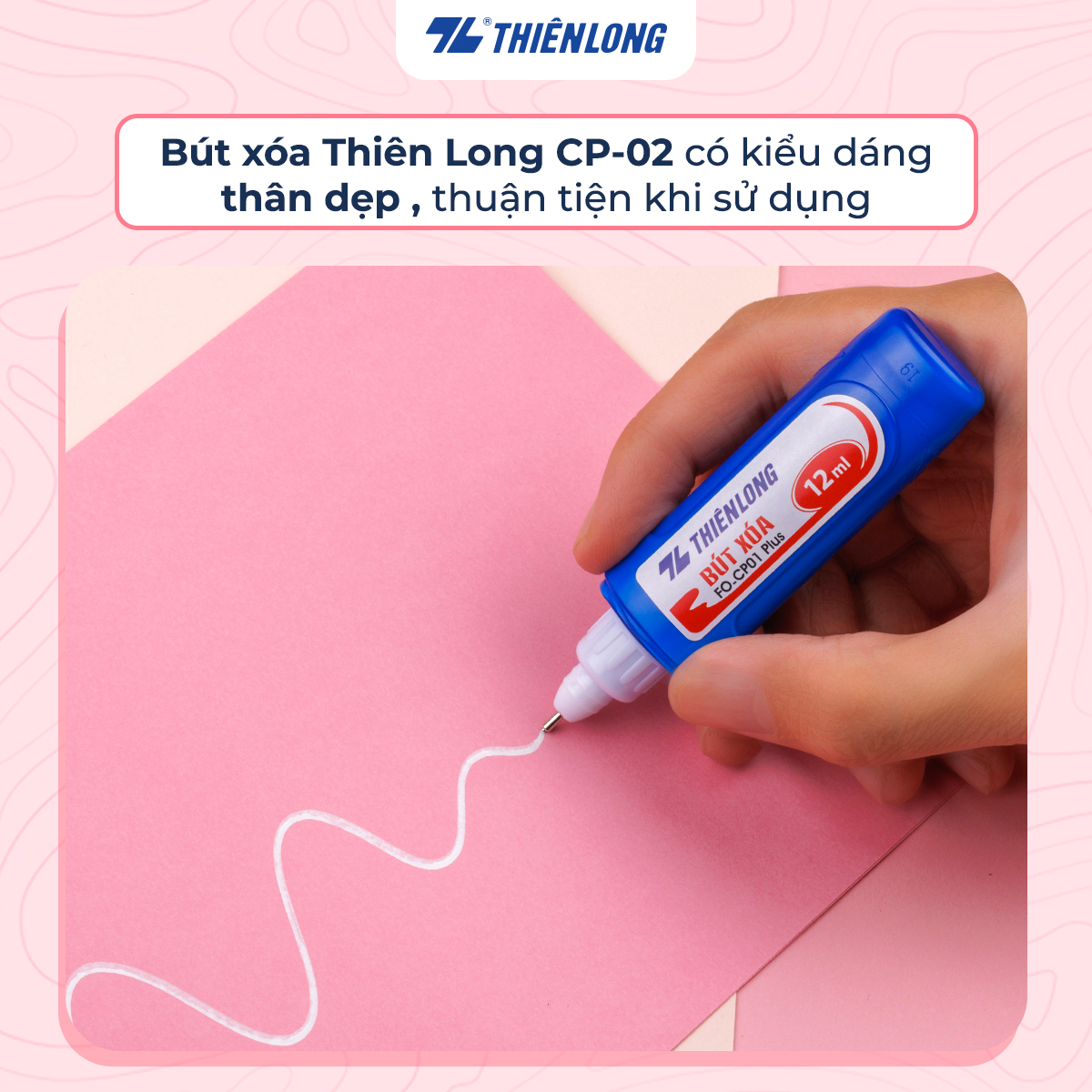Thương Hiệu: Thiên Long Model: CP02 Dung tích: 12ml Xuất xứ: Việt Nam Bút Xóa Thiên Long CP-02 Bút xóa Thiên Long CP02 có kiểu dáng thân đẹp, vừa tầm tay , thuận tiện khi