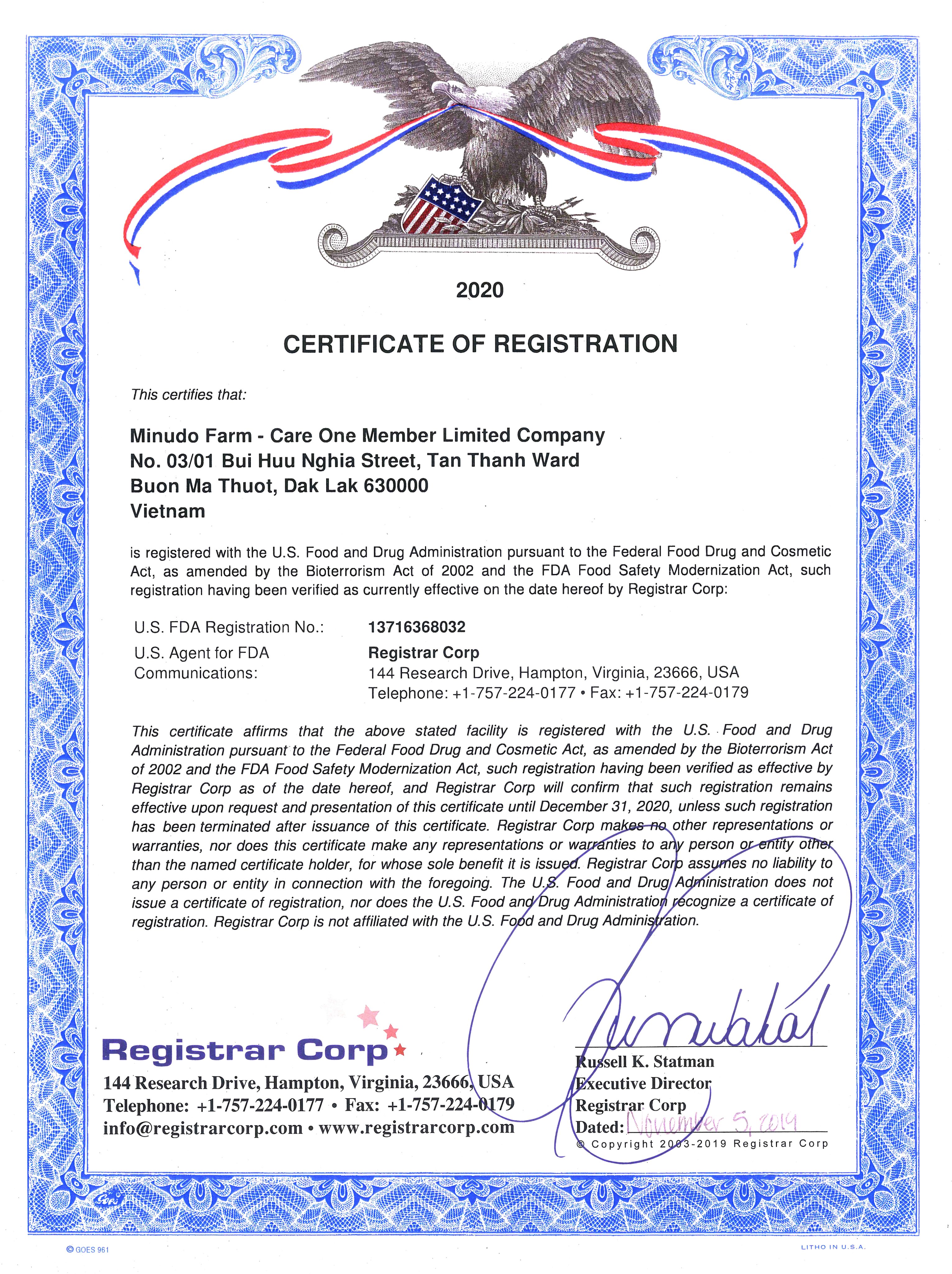100% Quả chín mới được thu hoạch để đảm bảo hương vị ngon nhất. ️Quy trình sản xuất đạt tiêu chuẩn Châu u: HACCP Codex Alimentarius: Chứng nhận vệ sinh an toàn thực phẩm, được Quốc tế công nhận. ISO 22000-2018: Chứng nhận quản lý chất lượng về quy trình sản xuất. FDA (Mỹ): Chứng nhận vệ sinh an toàn thực phẩm của Mỹ. Chứng nhận cà phê đặc sản: Chứng nhận cà phê đạt chuẩn đặc sản trong 3 năm liên tiếp. HACCP: Chứng nhận vệ sinh an toàn thực phẩm Việt Nam.