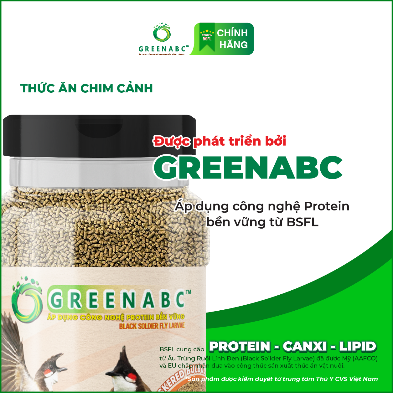 GREENABC là thức ăn cao cấp dành cho CHIM CHÀO MÀO. Đặc biệt sản phẩm GREENABC được sản xuất theo phương pháp Áp dụng công nghệ PROTEIN bền vững từ bột đạm G.Meal rất giàu PROTEIN – CANXI – LIPID có trong BSFL, đã được Mỹ (AAFCO) và EU chấp nhận đưa vào công thức cho ngành sản xuất thức ăn dành cho vật nuôi.