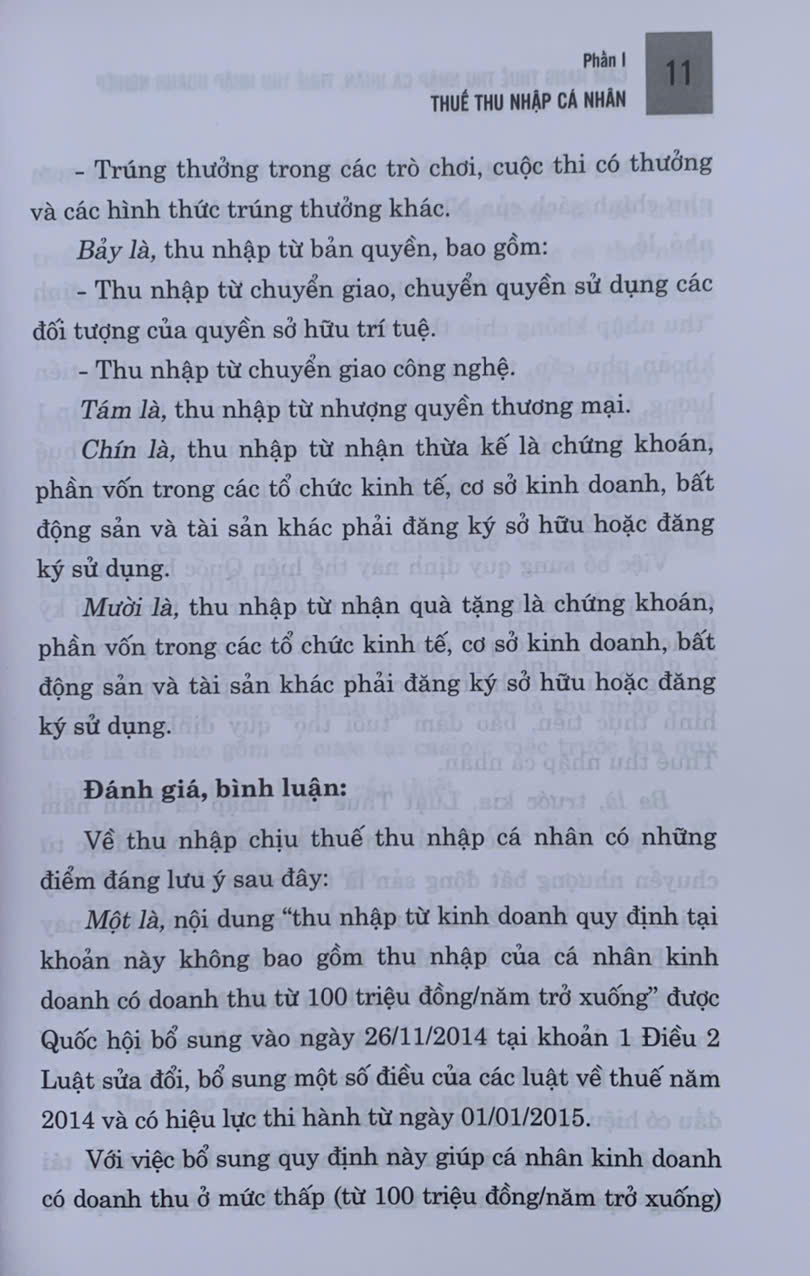 Cẩm nang thuế thu nhập cá nhân, thuế thu nhập doanh nghiệp Tác giả: Luật sư PHẠM THANH HỮU Nhà xuất bản: Chính Trị Quốc Gia Sự Thật Công ty phát hành: NXB Chính Trị Quốc Gia Sự Thật Ngày phát hành: Tháng 9/2024 Khổ sách: 14,5*20,5cm Số trang: 158 Giá bìa: 66.000đ Hình thức bìa: Bìa mềm   Pháp luật về thuế thu nhập cá nhân, thuế thu nhập doanh nghiệp là những vấn đề quan trọng, gần gũi với người lao động và doanh nghiệp... Tuy nhiên, vì các lý do khác nhau nhiều người chưa có điều kiện để tìm hiểu, nắm bắt đầy đủ các quy định pháp luật về thuế thu nhập cá nhân, thuế thu nhập doanh nghiệp dẫn đến gặp rủi ro pháp lý, không bảo vệ được quyền lợi và lợi ích chính đáng cho cá nhân và doanh nghiệp. Nhằm giúp bạn đọc thuận tiện trong việc nắm bắt các quy định pháp luật về thuế thu nhập cá nhân, thuế thu nhập doanh nghiệp, từ đó thực hiện đúng, tránh được những rủi ro pháp lý, bảo vệ được quyền và lợi ích hợp pháp của bản thân và doanh nghiệp, NXB Chính trị quốc gia Sự thật xuất bản cuốn sách Cẩm nang thuế thu nhập cá nhân, thuế thu nhập doanh nghiệp do Luật sư Phạm Thanh Hữu biên soạn. Cuốn sách cung cấp cho bạn đọc các chính sách về thuế thu nhập cá nhân, thuế thu nhập doanh nghiệp, thủ tục hoàn thuế; cập nhật các quy định mới bắt đầu có hiệu lực thi hành từ ngày 01/8/2024 và phân tích, bình luận các quy định mới quan trọng về thuế thu nhập cá nhân, thuế thu nhập doanh nghiệp, thủ tục hoàn thuế. Nội dung cuốn sách gồm ba phần: Phần I: Thuế thu nhập cá nhân; Phần II: Thuế thu nhập doanh nghiệp; Phần III: Thủ tục hoàn thuế.