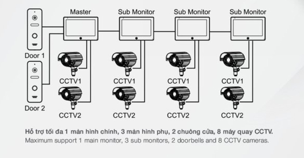 - 2 camera chuông cửa + 2 camera an ninh (CCTV) + 4 màn hình