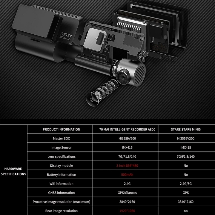 - Điểm đáng chú ý nhất trên Camera hành trình ô tô 70MAI mới này chính là được trang bị độ phân giải đến 3840x2160P, ghi hình độ nét cao UHD, tạo ra chất lượng hình ảnh 4K vô cùng rõ nét và chi tiết trong suốt hành trình. Bộ vi xử lý lõi kép SigmaStar SSC8629G mạnh mẽ hơn, hỗ trợ đầu vào cảm biến kép cùng công nghệ đầu ra mã hóa hình ảnh mới để xử lý chất lượng hình ảnh siêu nét 4K ở tốc độ cao.