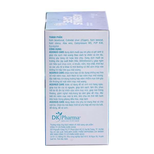 - Chứa Bộ 3 Natri bicarbonat, Natri benzoat và Natri clorua trong Muối Nano Bạc Agsinus Care giúp kháng khuẩn, loại bỏ mọi bụi bẩn, giúp khoang mũi thông thoáng, cơn ngứa được xua tan.