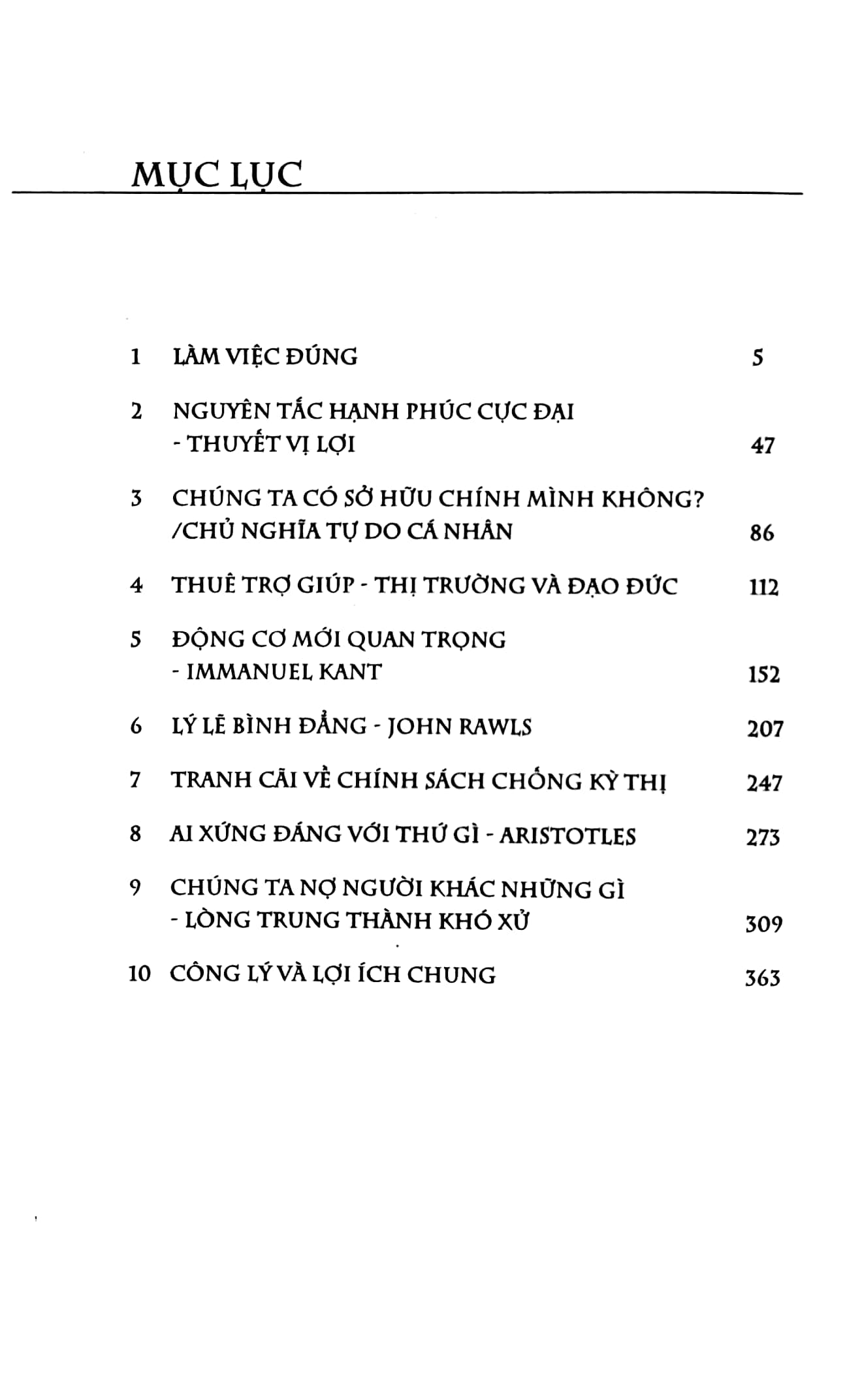 Sách bàn về vấn đề đạo đức dưới cái nhìn triết học. Tác giả đưa ra các vụ việc gây tranh cãi về vấn đề đạo đức để mổ xẻ dưới nhiều góc độ, theo quan điểm của các học thuyết triết học khác nhau, mỗi chương trình bày sâu về một học thuyết. Nhờ vậy, tư tưởng của Aristotle, Jeremy Bentham, Immanuel Kant, John Stuart Mill, Robert Nozick, và John Rawl được trình bày với sự rõ ràng và gần gũi, mà theo New York Times là "hiếm khi được giải thích dễ hiểu đến như vậy".
