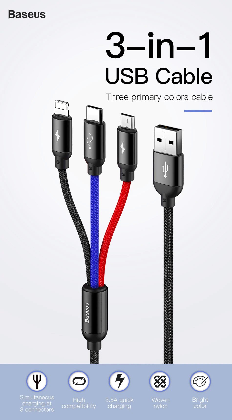Với Cáp sạc 3 đầu và truyền dữ liệu tốc độ cao Baseus Three Primary Colors 3 in 1 cable CAMLT-BSY (USB to Type C/ Micro/ Light-ning Fast Charging Cable, 3.5A) bạn sẽ không phải mang theo nhiều sợi cáp khác nhau, có thể sử dụng đồng thời với nhiều thiết bị cùng lúc vô cùng tiện lợi và an toàn.